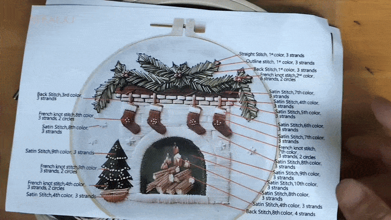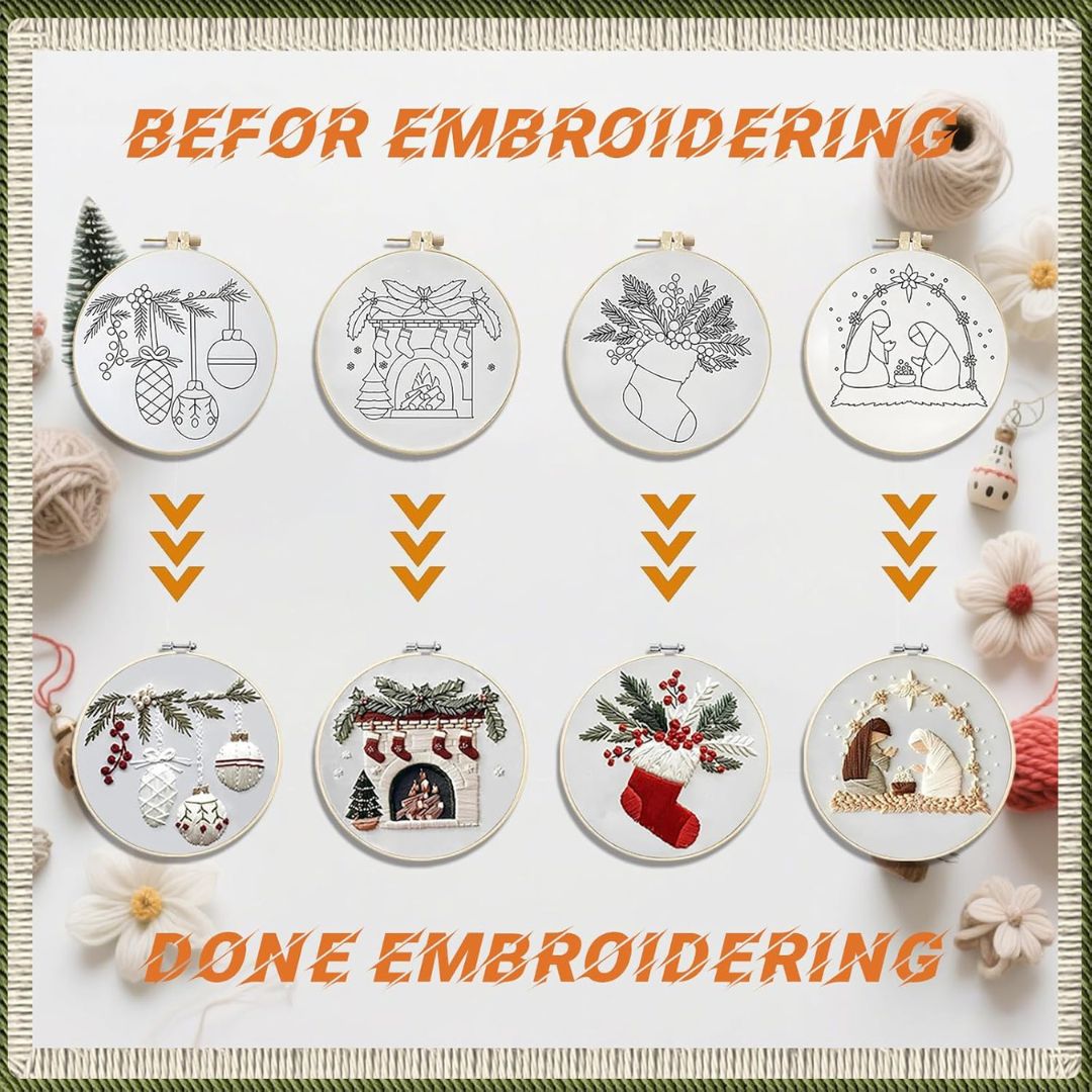 Each kit comes with embroidery fabric, pre-printed holiday design, colored threads, needles, and an embroidery hoop.